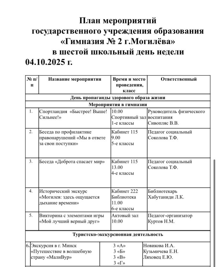 ГУО "Гимназия №2 г.Могилёв" - Официальный сайт » Главная » План мероприятий в шестой школьный день 04.10.2025г.