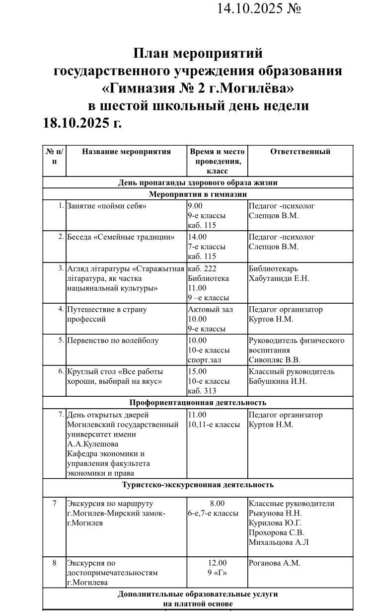 ГУО "Гимназия №2 г.Могилёв" - Официальный сайт » Главная » План мероприятий в шестой школьный день 18.10. 2025г.