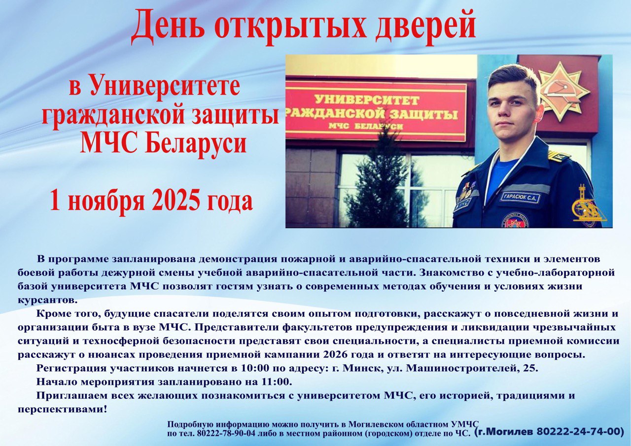 Вы задумываетесь о будущем, где каждый день имеет смысл, а ваша работа приносит неоценимую пользу обществу? Мечтаете о престижной, стабильной и по-настоящему важной профессии? Университет гражданской защиты МЧС Беларуси приглашает вас на День открытых дверей!