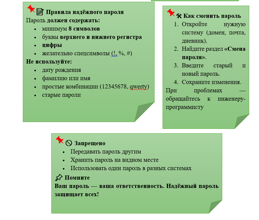 - Сообщать ИТ‑специалисту при любых подозрениях.