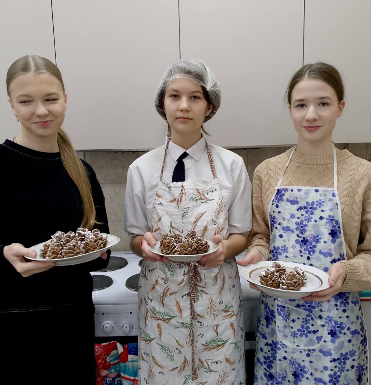 А ребята из 9 «Б» класса учились готовить праздничное пирожное «Новогодние шишки», чтобы в новогоднюю ночь порадовать своих родных вкусным и красивым сюрпризом.