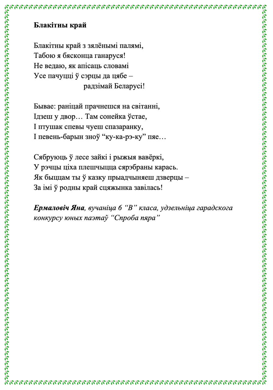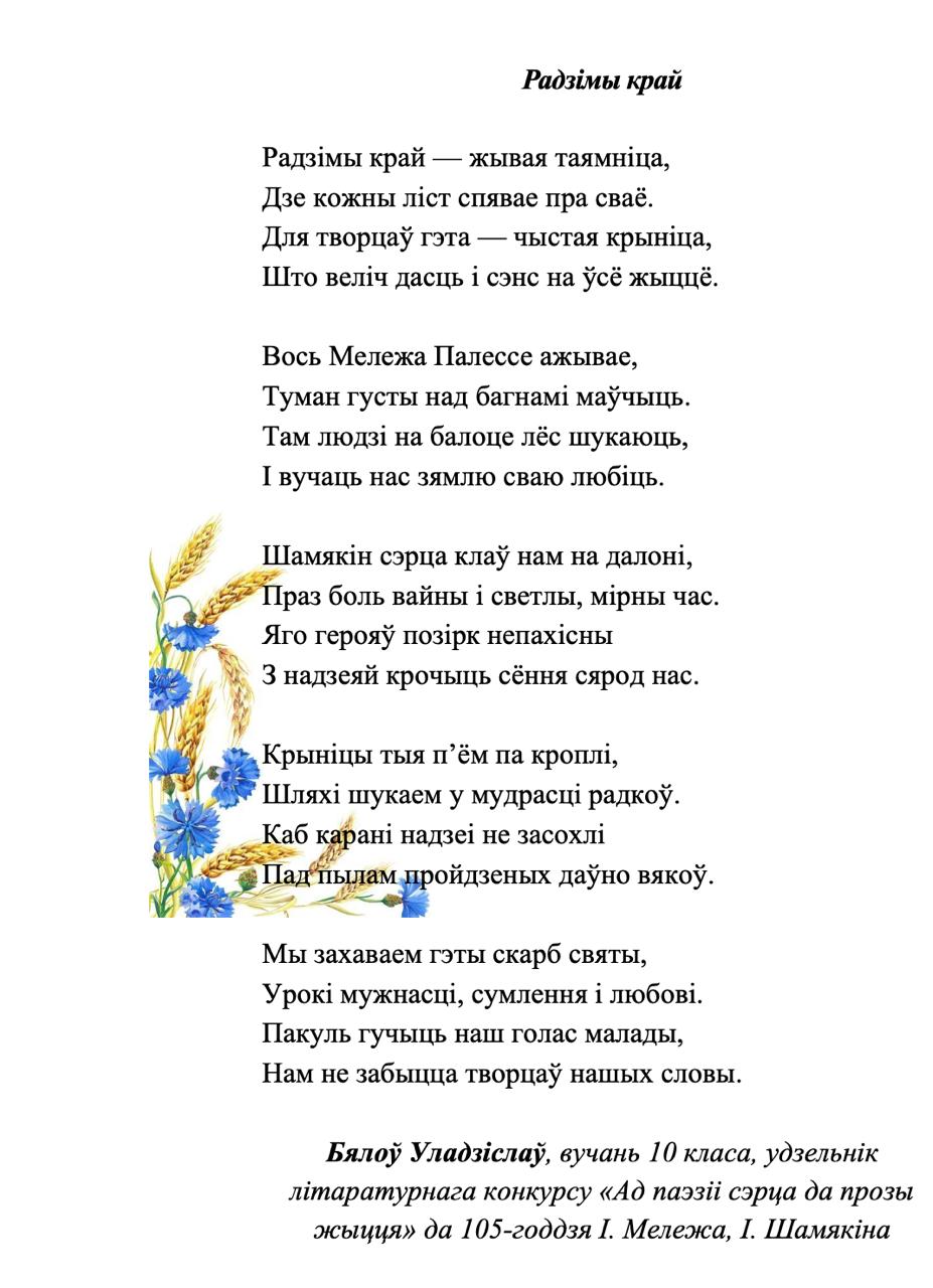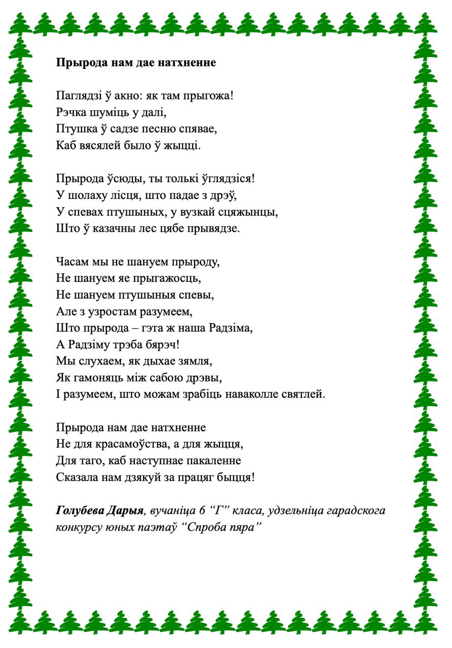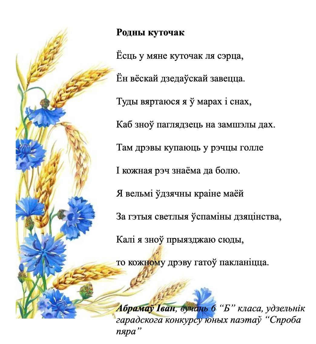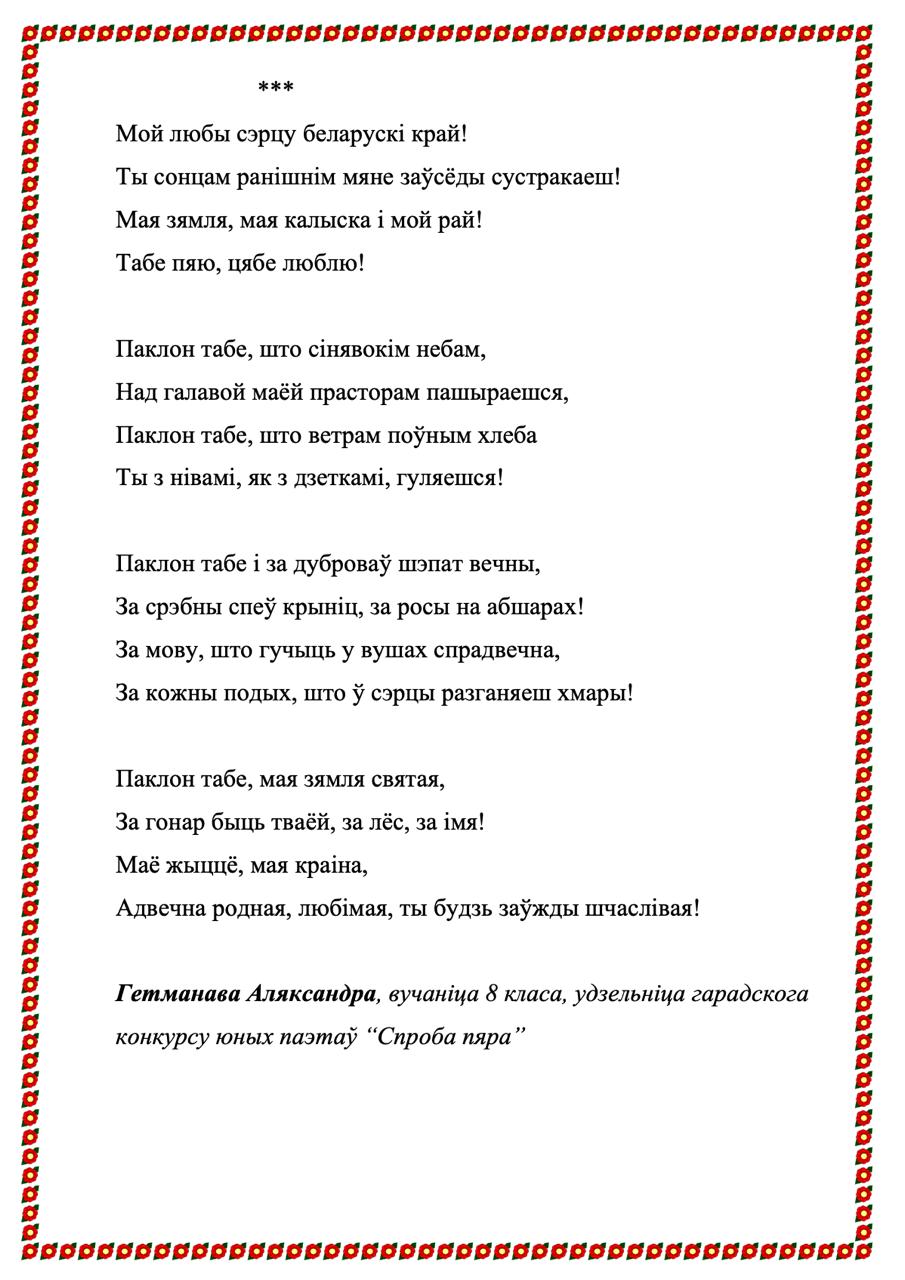 Kaжyць, мoвa мaя aджывae Beк cвoй цixi: ёй знiкнyць пapa. Для мянe ж янa вeчнa жывaя, Як paca, як cлязa, як зapa..." Гэтыя словы народнага паэта Беларусі Пімена Панчанкі адгукнуліся ў душы нашых таленавітых гімназістаў, якія сваімі першымі паэтычнымі спробамі даказваюць любоў да роднай зямлі, гонар за яе спадчыну, пашану да продкаў і слаўнага мінулага нашага краю, а таксама шчырую веру ў лепшую будучыню Радзімы. На працягу тыдня беларускай мовы і літаратуры ў гімназіі створаны паэтычны вернісаж "Спроба пяра". У каруселі вершы нашых вучняў.