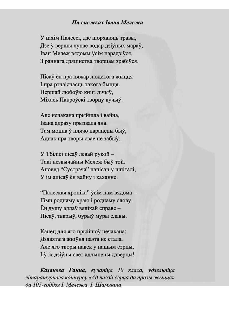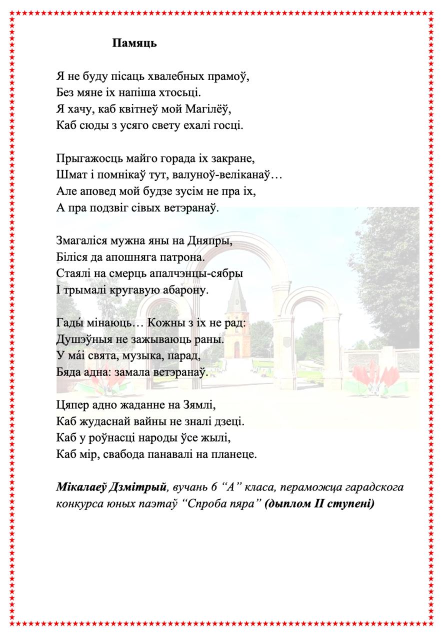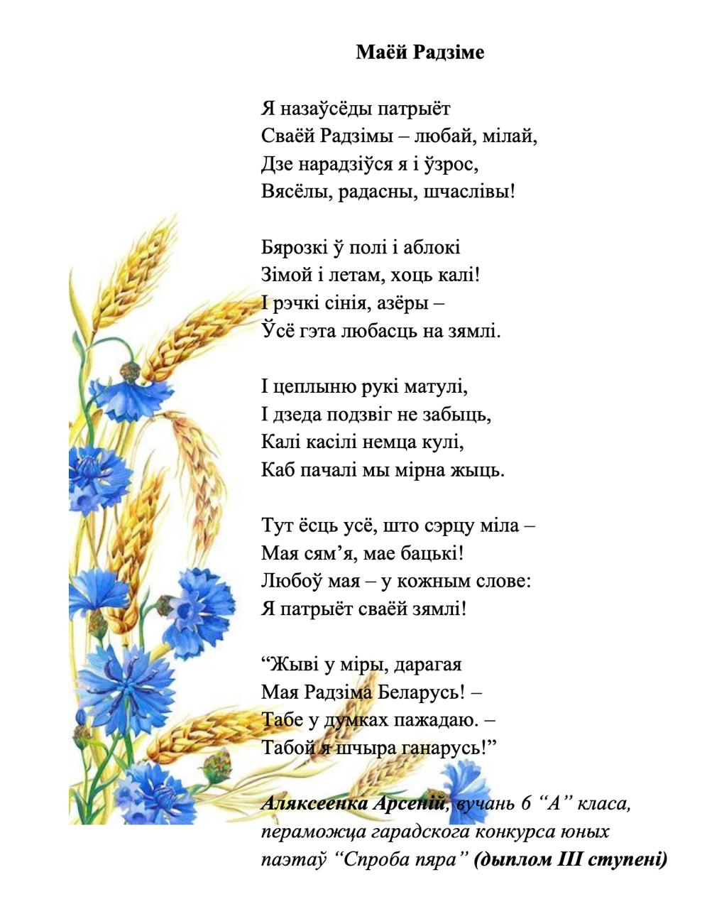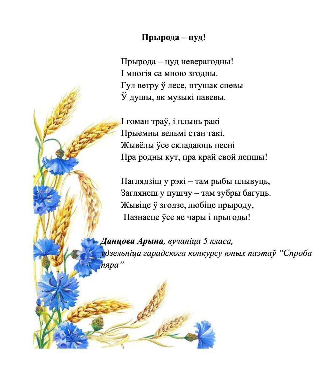 Kaжyць, мoвa мaя aджывae Beк cвoй цixi: ёй знiкнyць пapa. Для мянe ж янa вeчнa жывaя, Як paca, як cлязa, як зapa..." Гэтыя словы народнага паэта Беларусі Пімена Панчанкі адгукнуліся ў душы нашых таленавітых гімназістаў, якія сваімі першымі паэтычнымі спробамі даказваюць любоў да роднай зямлі, гонар за яе спадчыну, пашану да продкаў і слаўнага мінулага нашага краю, а таксама шчырую веру ў лепшую будучыню Радзімы. На працягу тыдня беларускай мовы і літаратуры ў гімназіі створаны паэтычны вернісаж "Спроба пяра". У каруселі вершы нашых вучняў.